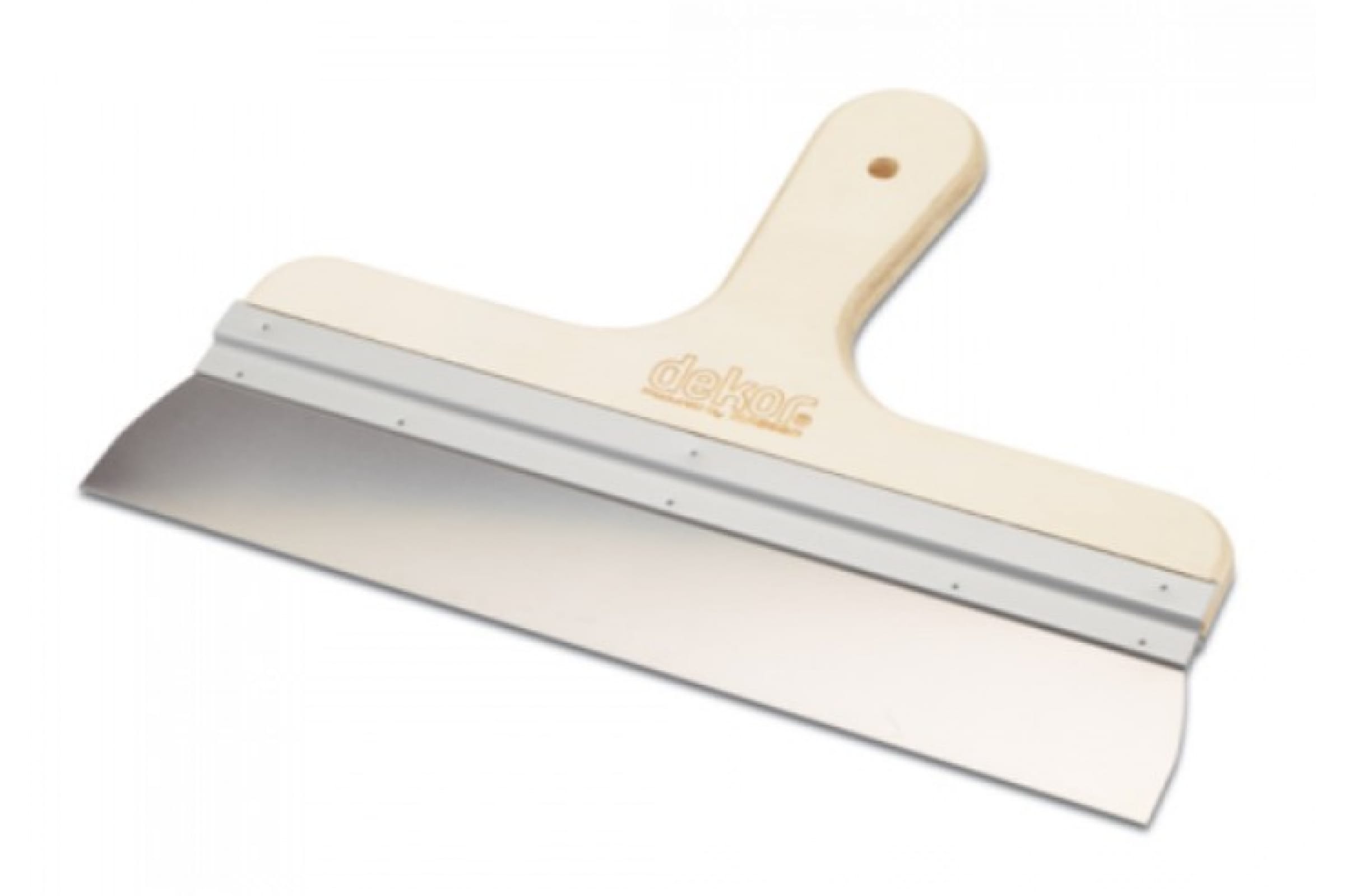 Фасадный шпатель DEKOR 200 мм деревянная ручка производится из нержавеющей и пружинистой стали. Ручка из специальной водостойкой фанеры. Для прочности в ручках инструмента расположен специальный алюминиевый профиль. Применяется для штукатурки стен и потолков.