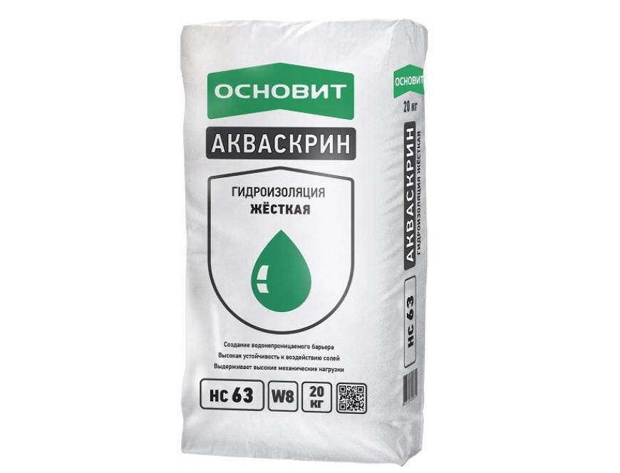 Гидроизоляция жесткая ОСНОВИТ АКВАСКРИН НС63 предназначена для гидроизоляции фундаментов зданий, фасадов, цоколей, подвалов, балконов, террас, стен и полов во влажных помещениях.