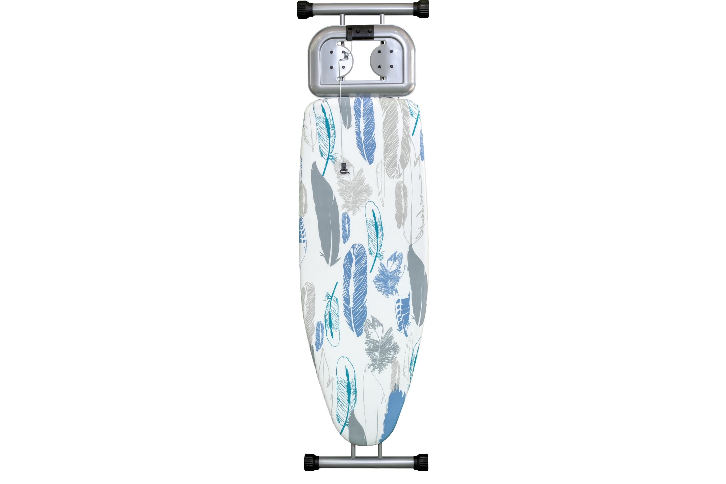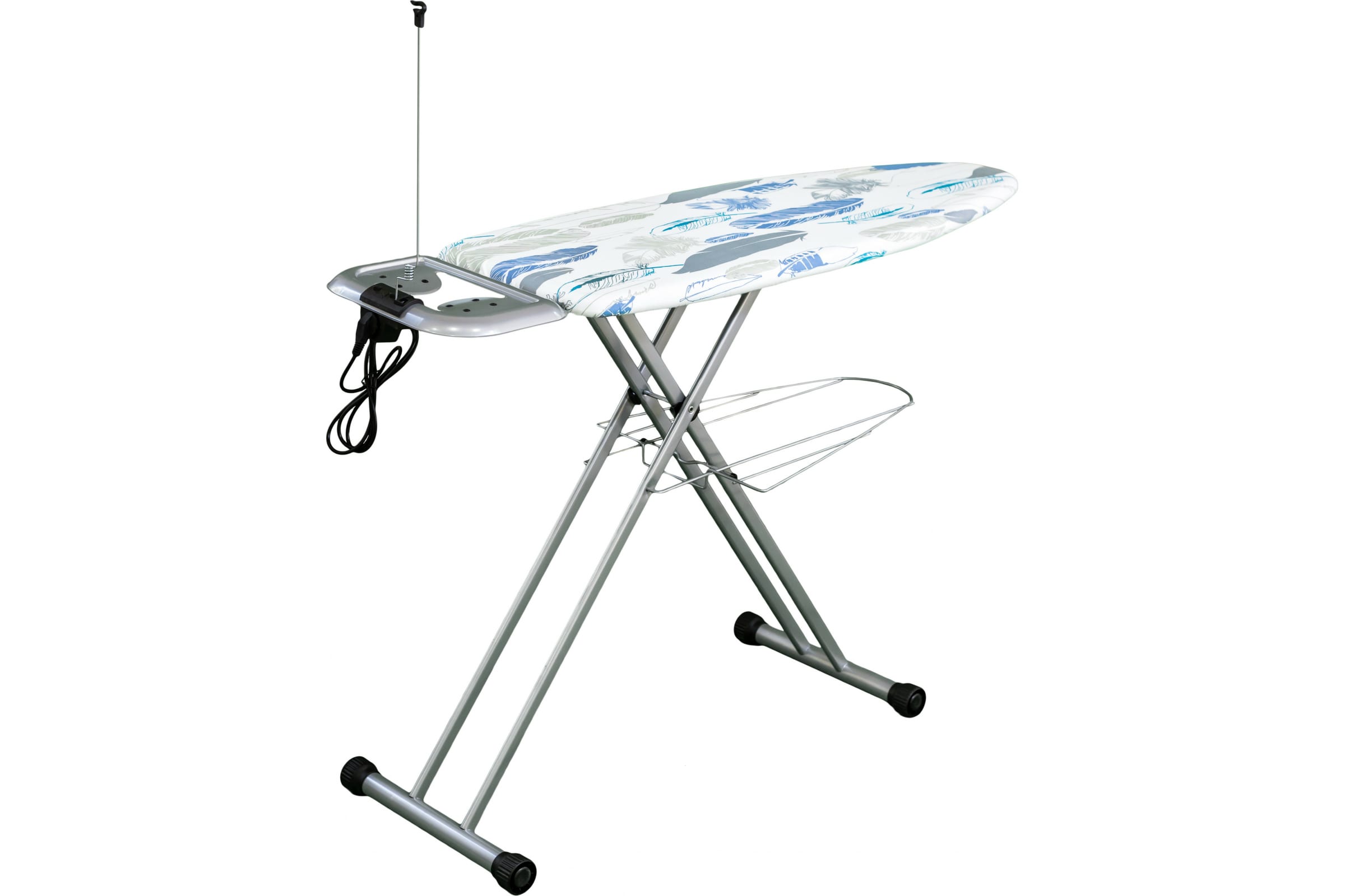Антипригарный чехол из натуральных материалов имеет поролоновую подкладку, он легко снимается с поверхности гладильной доски. Для утюга есть функциональная подставка с удобным держателем электрокабеля. Благодаря розетке с удлинителем возможно работать в любом удобном месте. Для выглаженного белья есть широкая полочка. Доску можно регулировать по высоте.